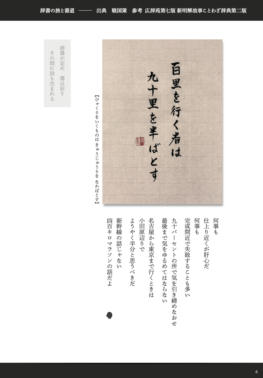 今号で発表した楽曲『願い』は、その最新の結晶です。言葉になる前の感情、誰かの無事を願う愛が、旋律とともに静かに灯っていきます。人とAI、そして何より辞書の智慧との共同制作。次の段には、広辞苑の辞書の旅の「ひ」で通った言葉を紹介します。最近の講演で最も評判のよかった諺です。ちなみに、「百里を行く」とあると現代人は距離の感覚が掴みづらいですが、大体名古屋から東京くらいです。